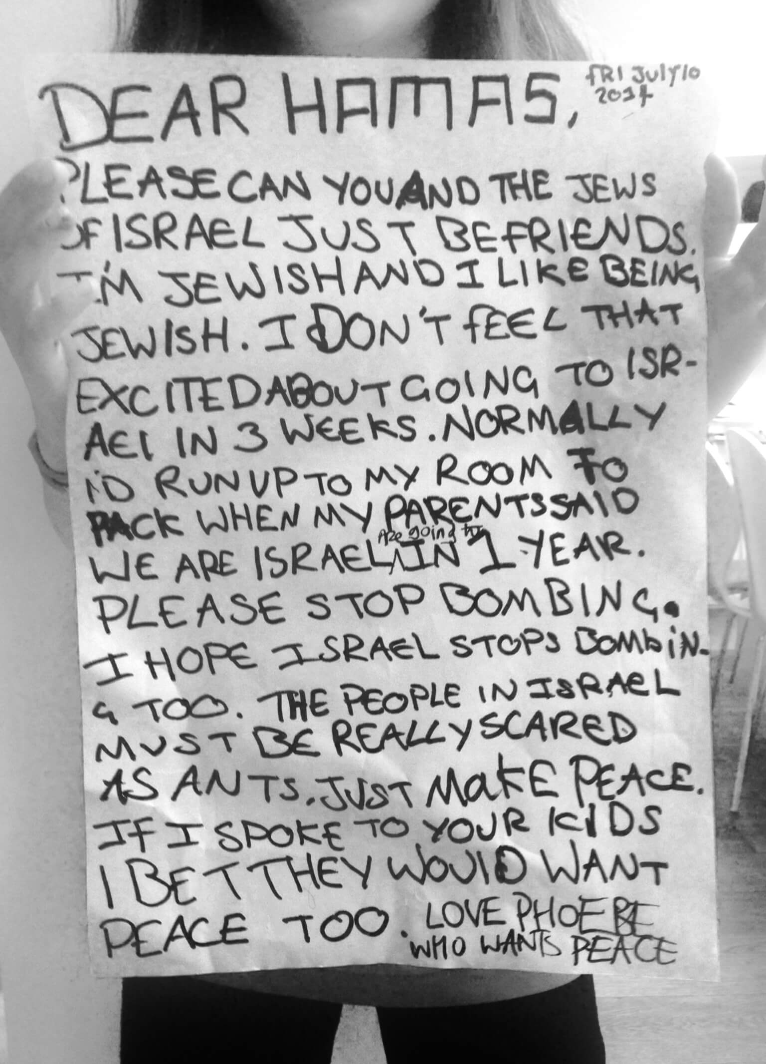 Archived: “Dear Hamas . . .” 22 July 2014 As a result of the ongoing troubles in Gaza, Phoebe Black (aged 9) felt compelled to write a letter expressing her feelings. Read this emotive piece of correspondence below.