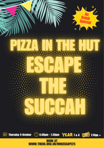 Pizza in the Hut – Escape the Succah Thu. 9 October , 6:00 pm Please book here. + Google Calendar+ Add to iCalendar