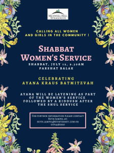 This event has passed. Shabbat Women’s Service Celebrating Ayana Kraus Batmitzvah Sat. 12 July , 9:30 am + Google Calendar+ Add to iCalendar