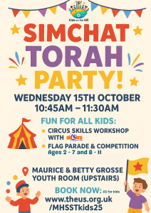 Simchat Torah Kids Party Wed. 15 October , 10:45 am Please book by clicking here. + Google Calendar+ Add to iCalendar