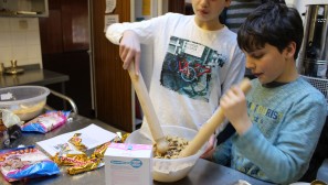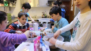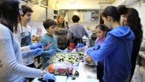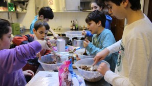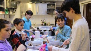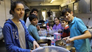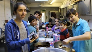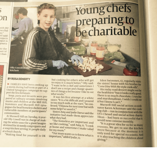 Muswell Hill’s young people made the press this week as the Jewish Chronicle featured an article about our first cooking club. Olly Cowen, Eden and Mitty Swimer, Theo Freeman and Jodie and Amy Darsa joined Helen Style, Karen Ackerman and Lisa Darsa to cook a three course meal for local community members and the soup kitchen at the Dukes Avenue Church. Olly took charge of a white sauce for the delicious vegetable lasagne, the boys enjoyed bashing biscuits for Rocky Road cookies whilst Amy and Jodie were busy chopping vegetables and putting the lasagne together. The food was all hugely appreciated and tasted great. We also put some in the freezer at shul so if you know anyone who would appreciate a home cooked meal, let the shul office know.